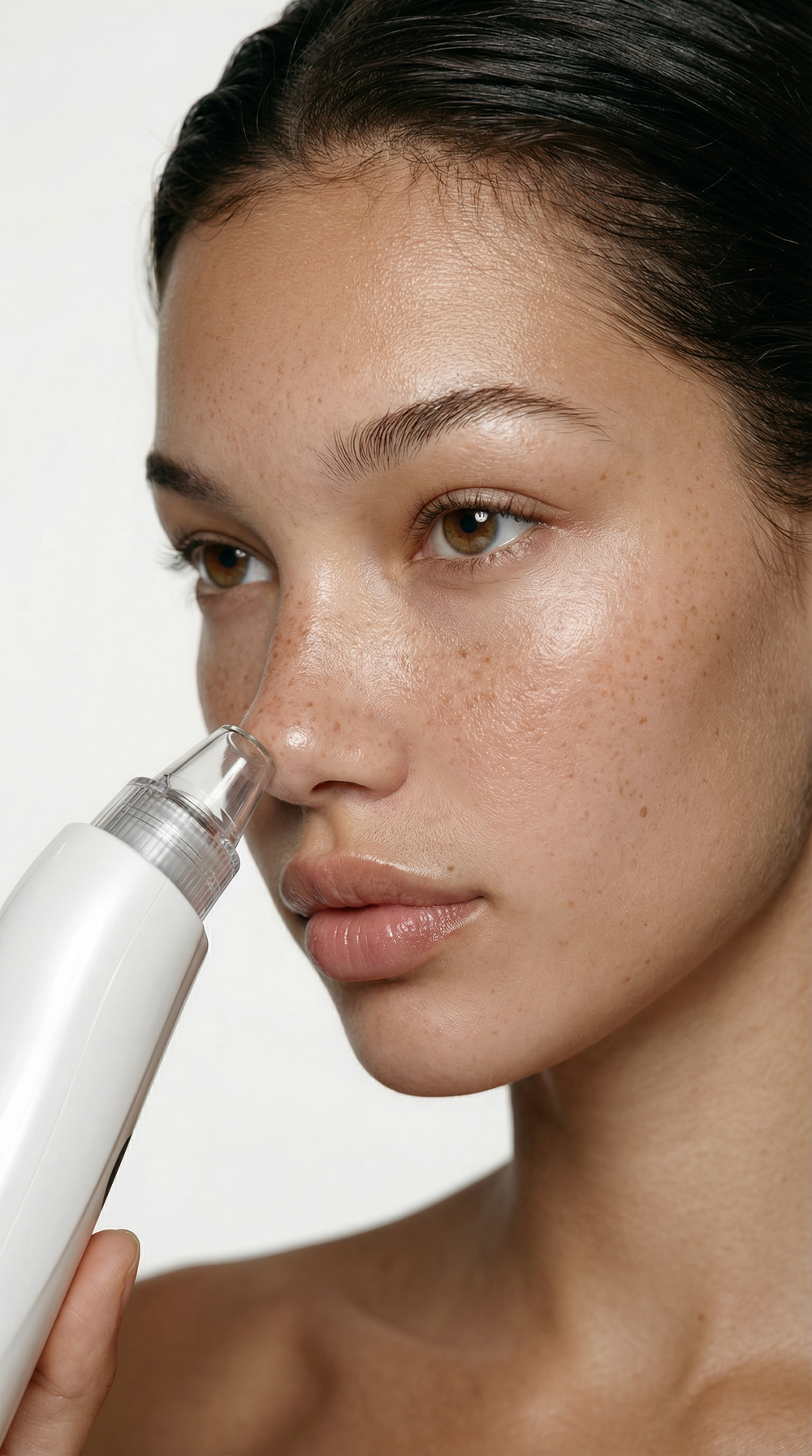 Aspiration ciblée des impuretés cutanées et activation du complexe blanchissant par flux pulsé haute fréquence.